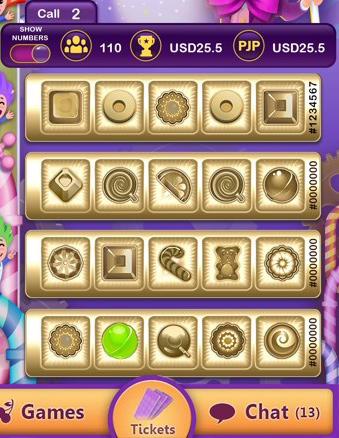 Tickets sold at 52-5 bingo games each contain 5 playing candies out of the standard 52 numbers. The cards are revealed immediately upon ticket purchase.